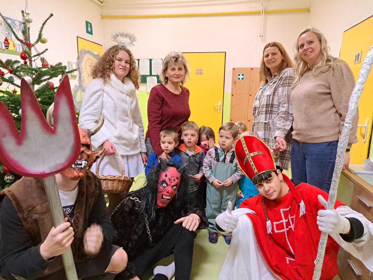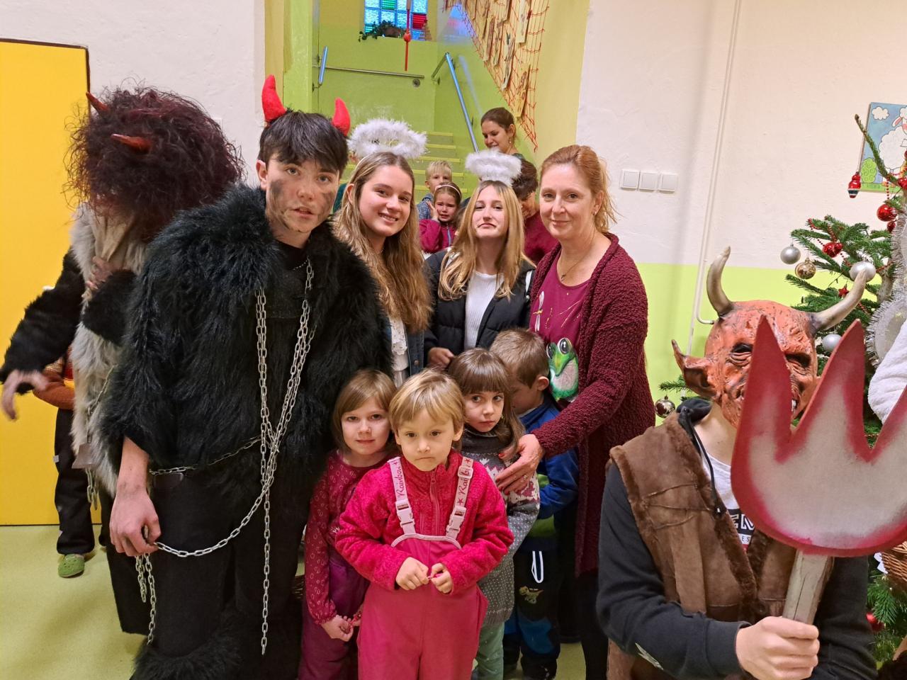 Do školky přišli čerti, andělé a Mikuláš. Byli to žáci z místní základní školy. Děkujeme:-)