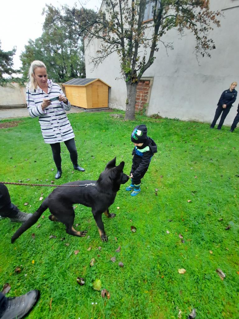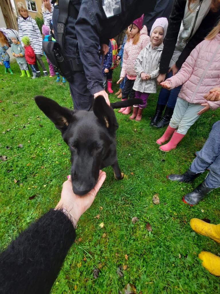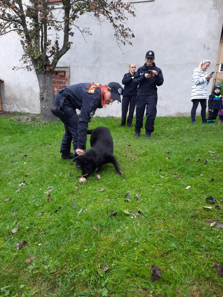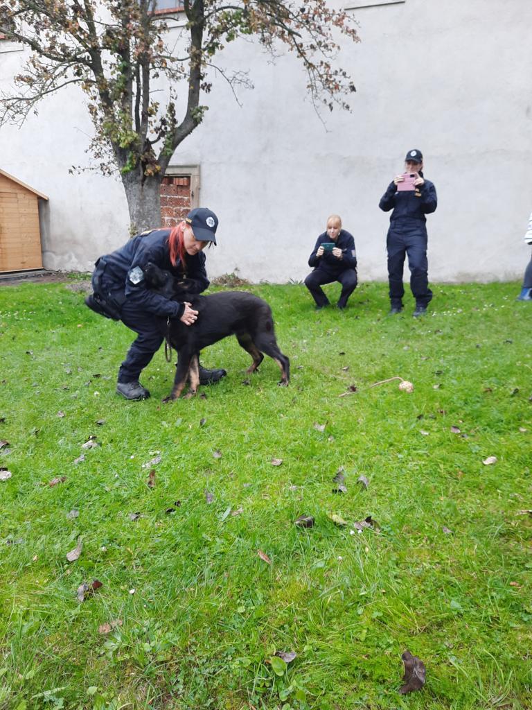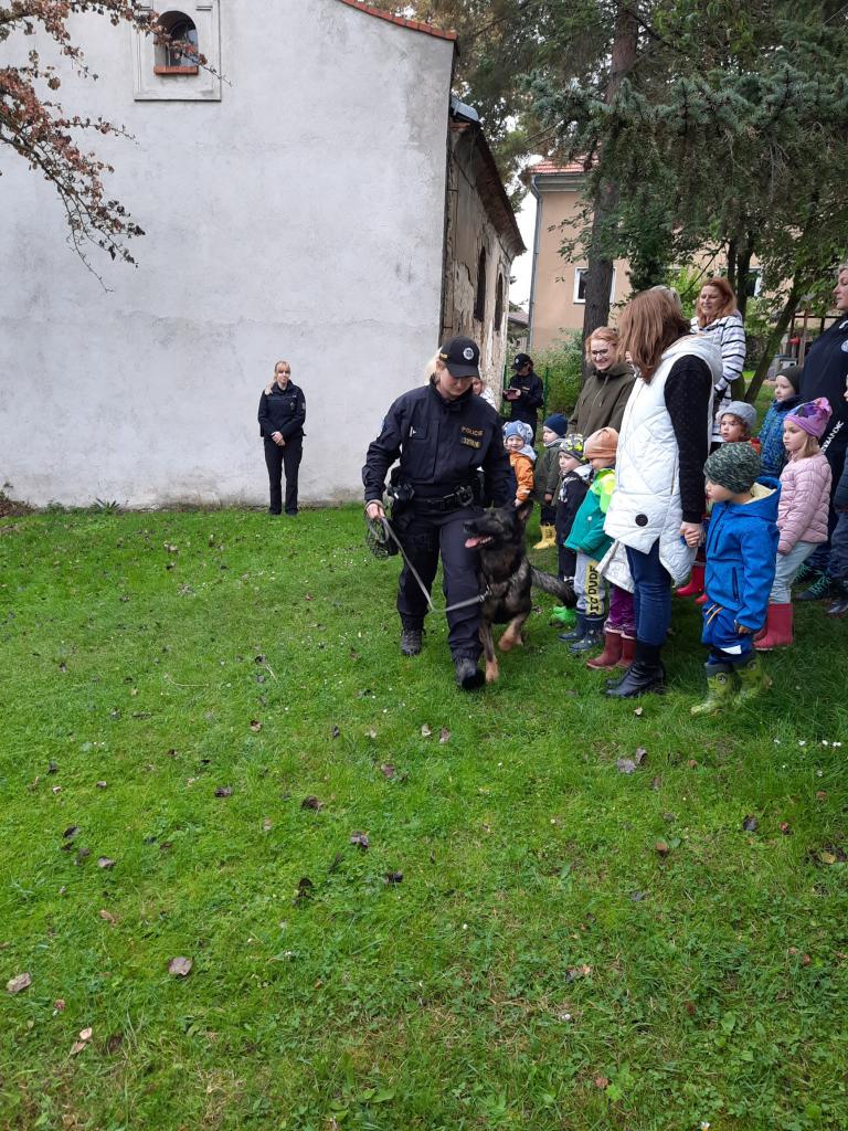Policie ČR - Žabičky. Na zahradě ukázka práce psovodů pro všechny třídy společně