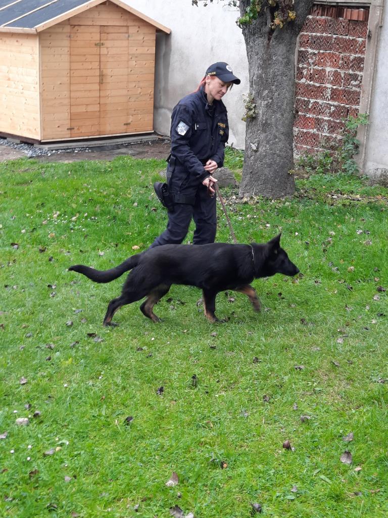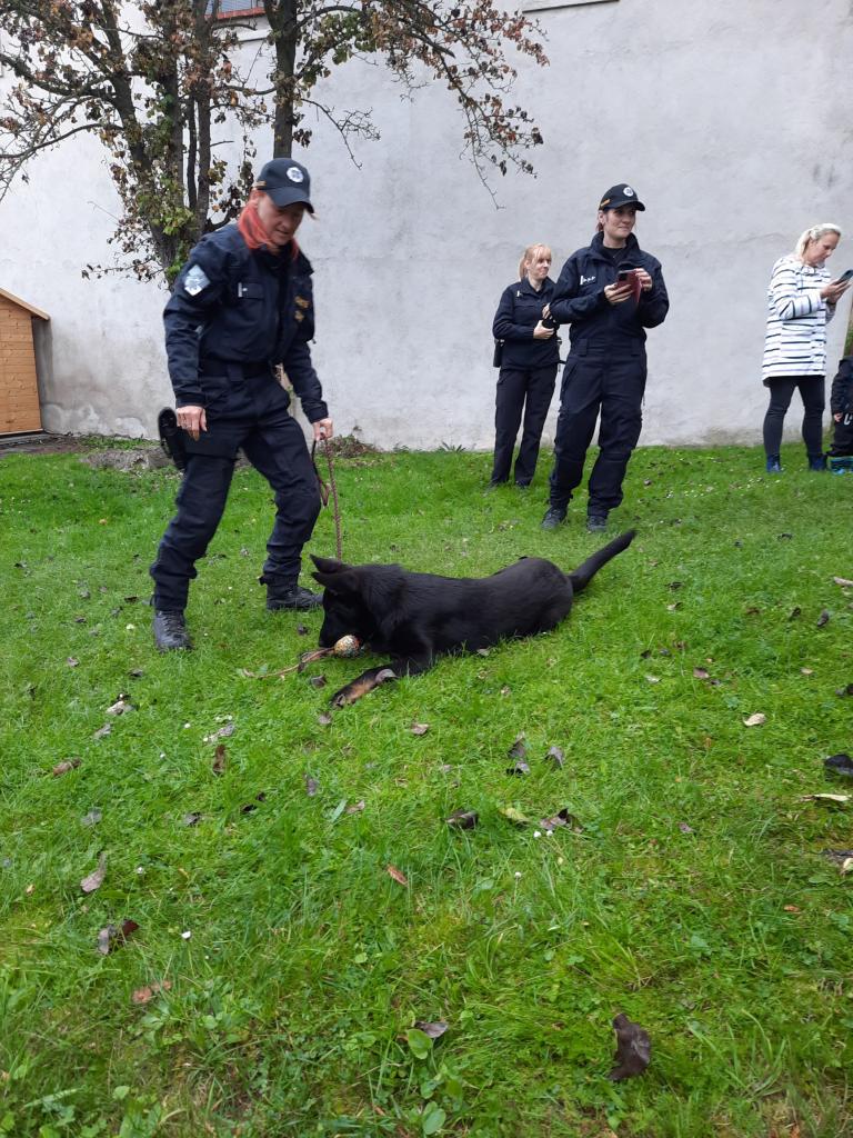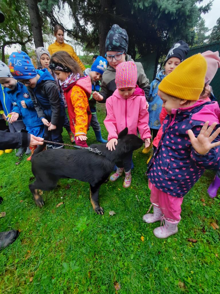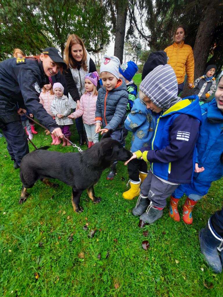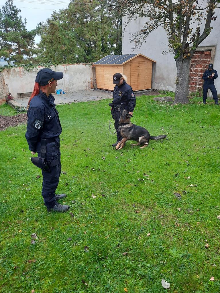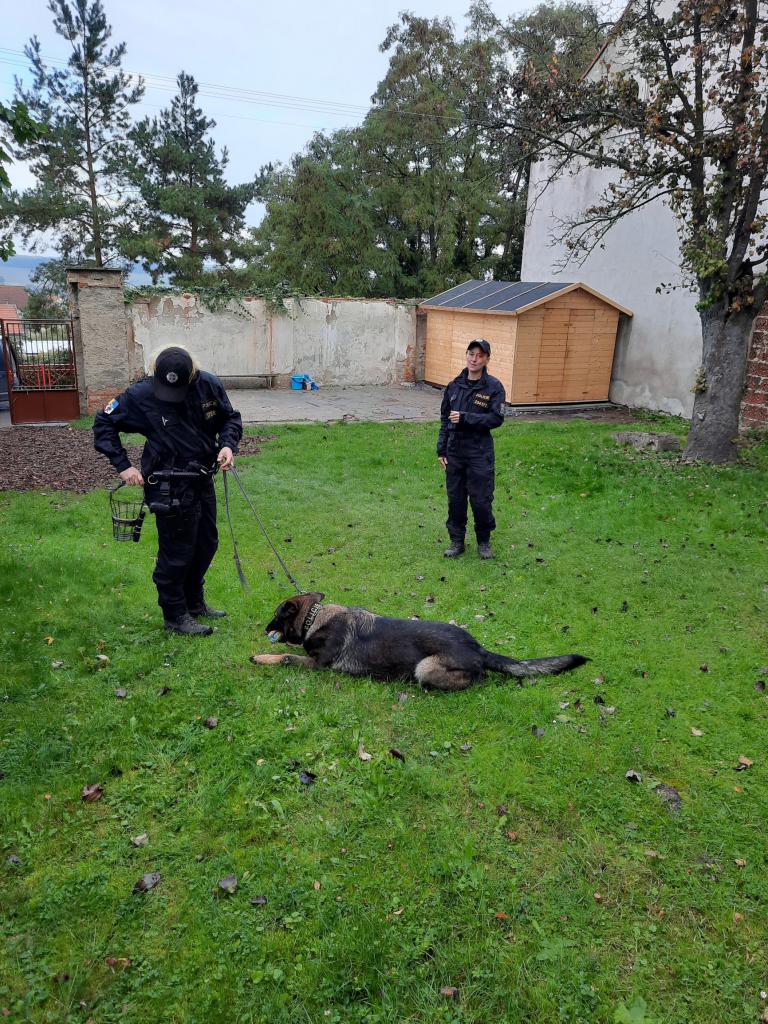 Policie ČR - Žabičky. Na zahradě ukázka práce psovodů pro všechny třídy společně