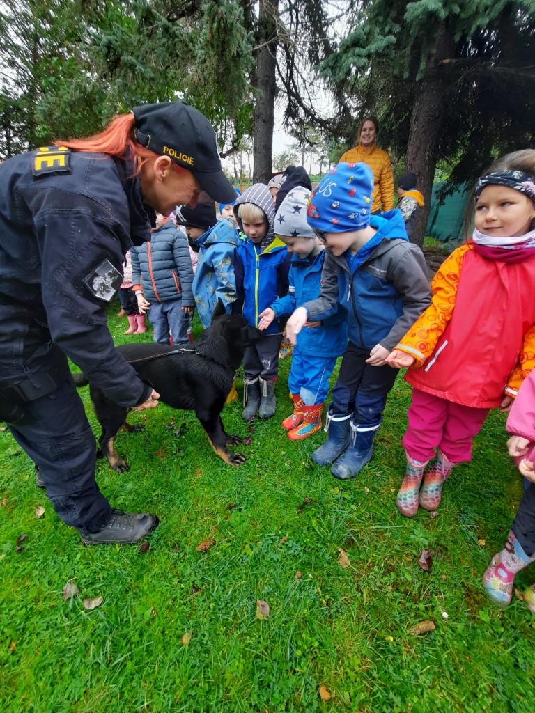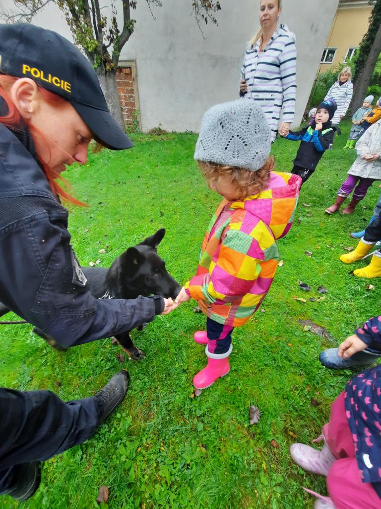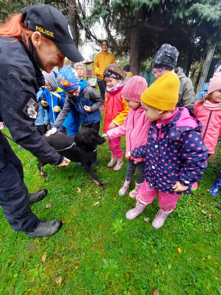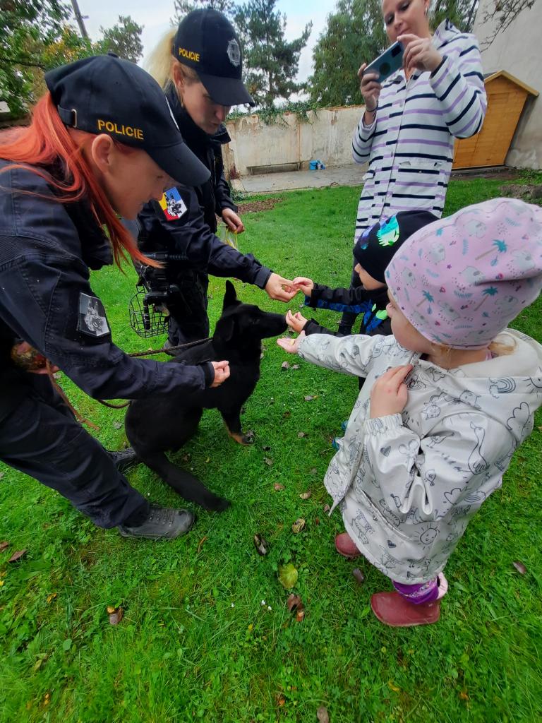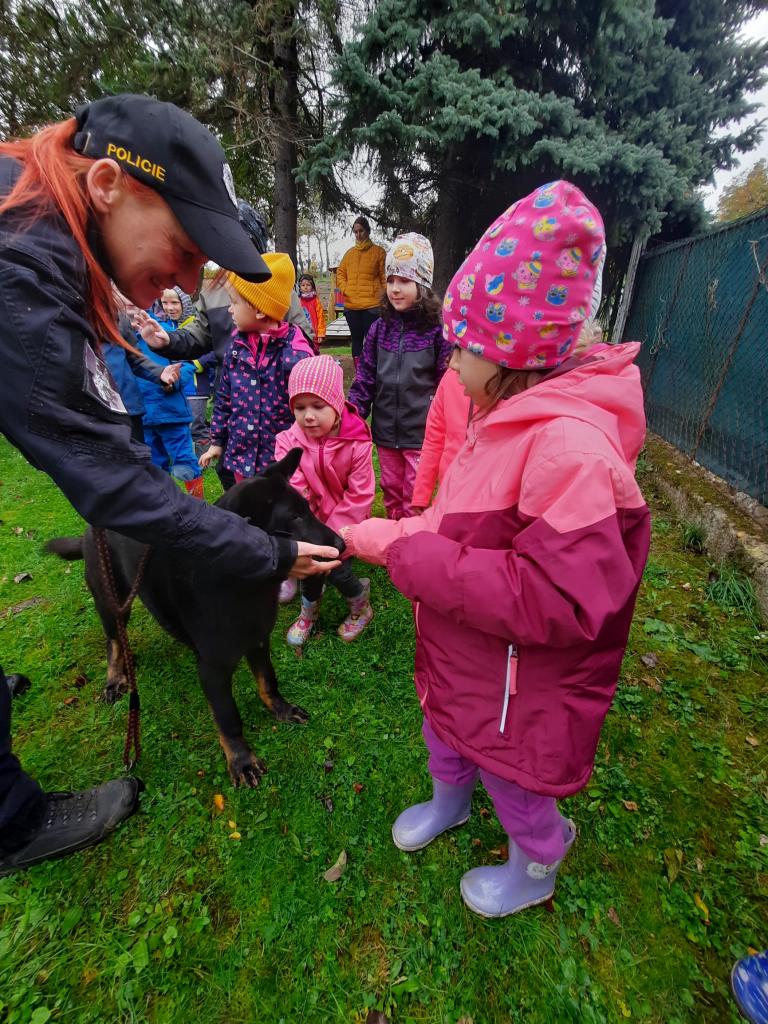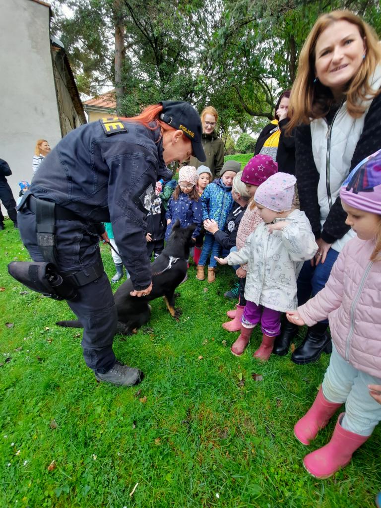 Do školky přijela Policie ČR a ukázala dětem vybavení policejních automobilů, práci psovodů se psy, promluvila o bezpečnosti v dopravě a o vlastním bezpečí dětí. Dětem se beseda moc líbila a my se těšíme na další spolupráci :-)