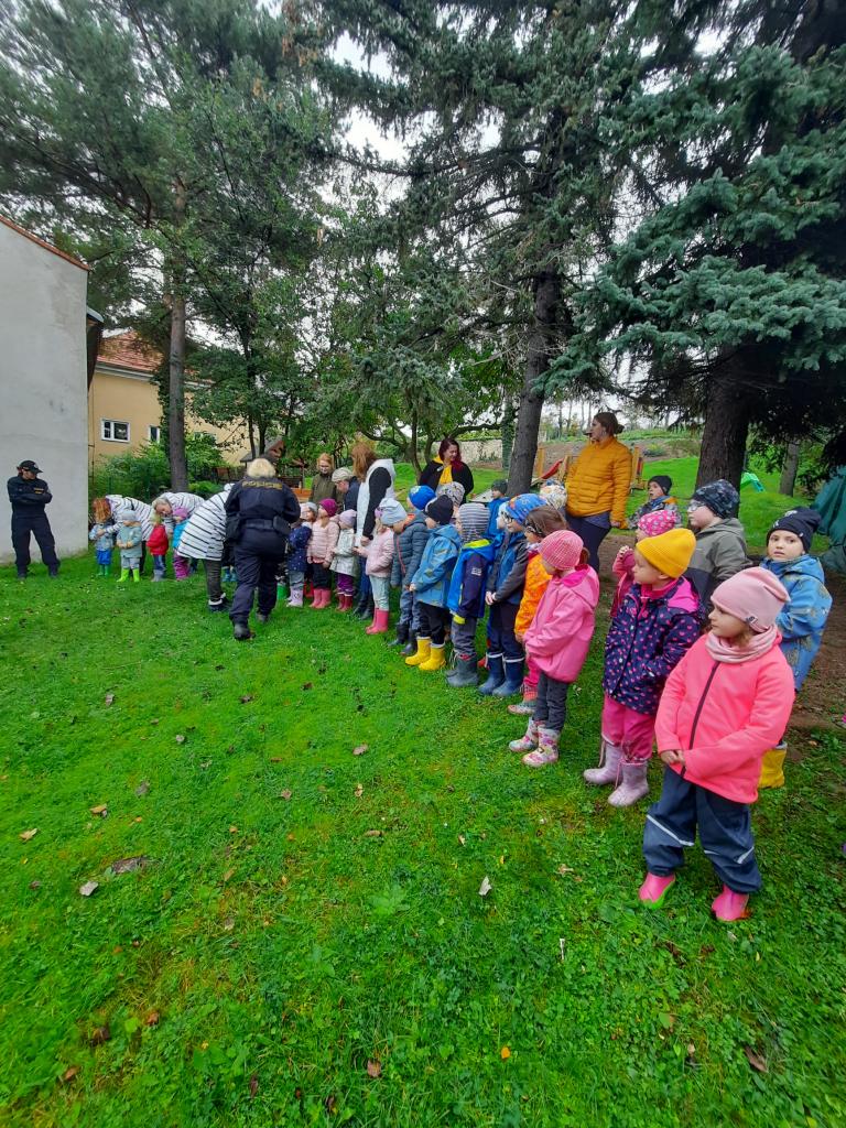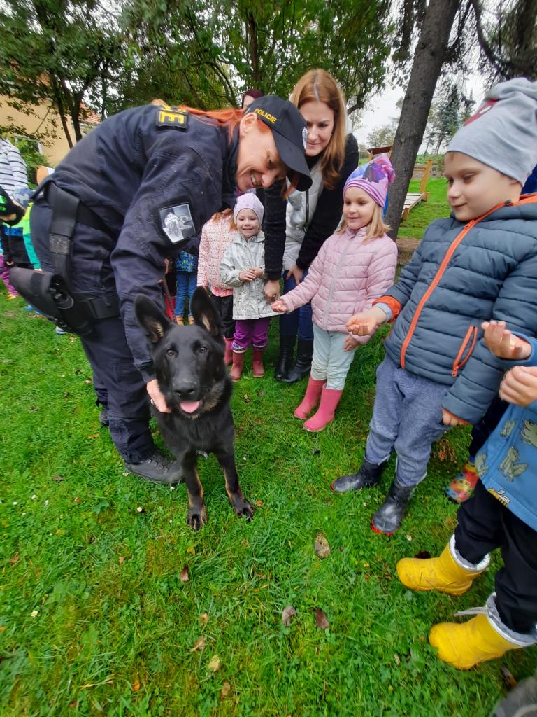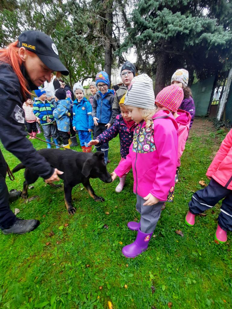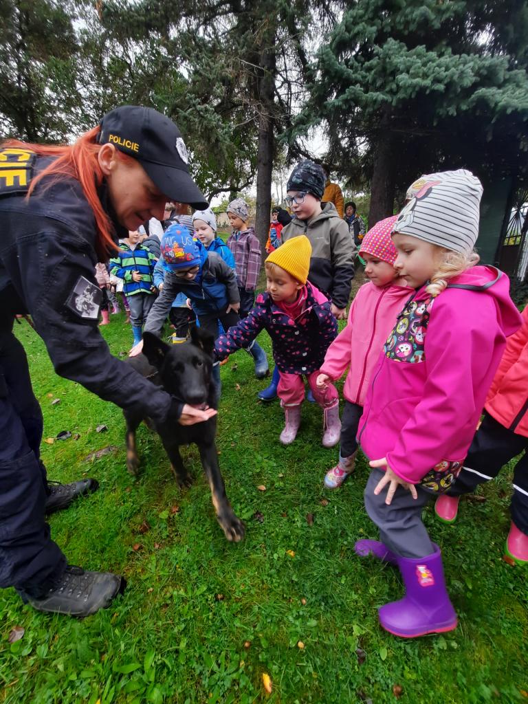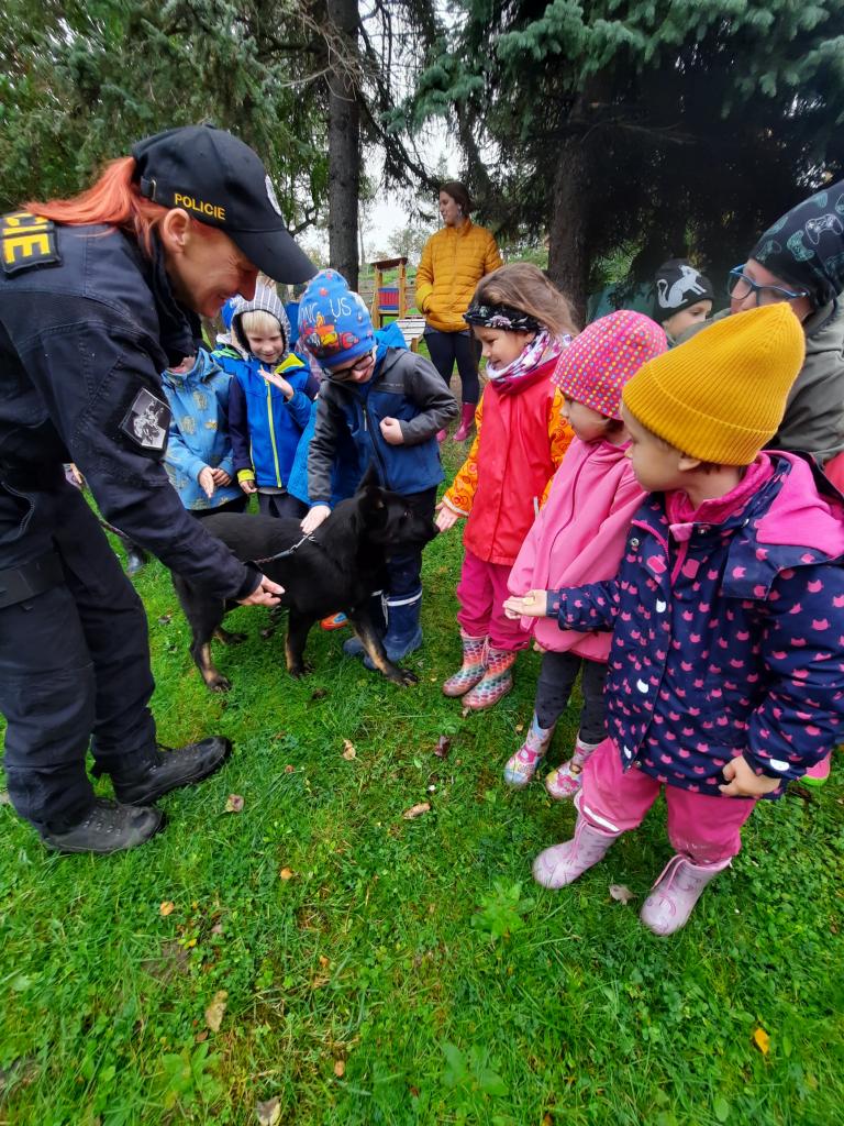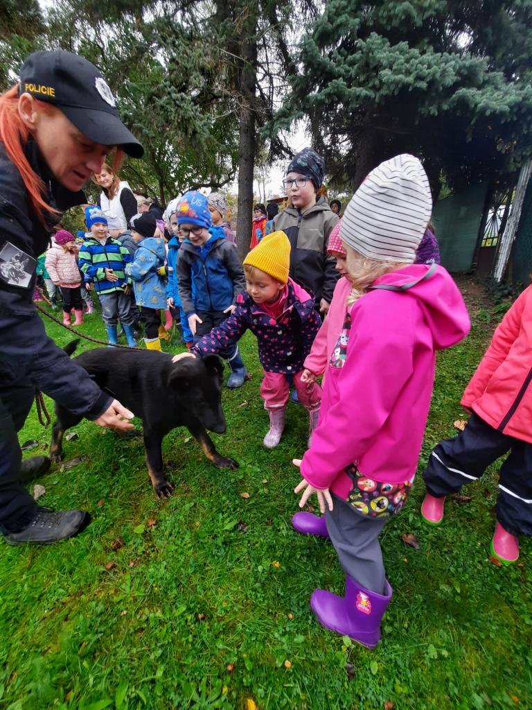 Do školky přijela Policie ČR a ukázala dětem vybavení policejních automobilů, práci psovodů se psy, promluvila o bezpečnosti v dopravě a o vlastním bezpečí dětí. Dětem se beseda moc líbila a my se těšíme na další spolupráci :-)
