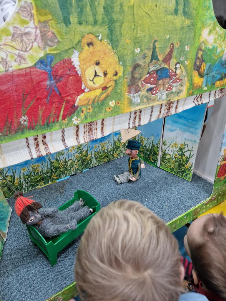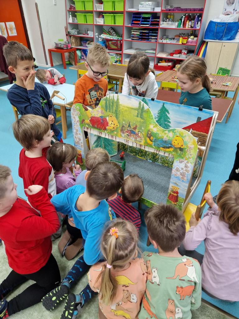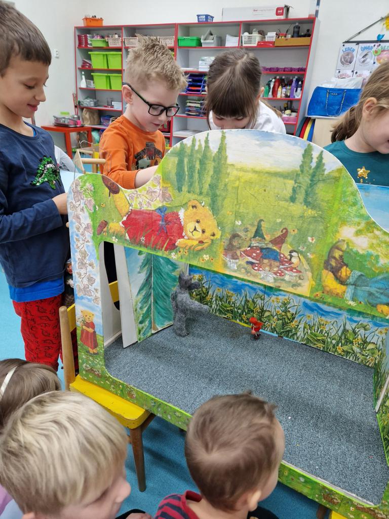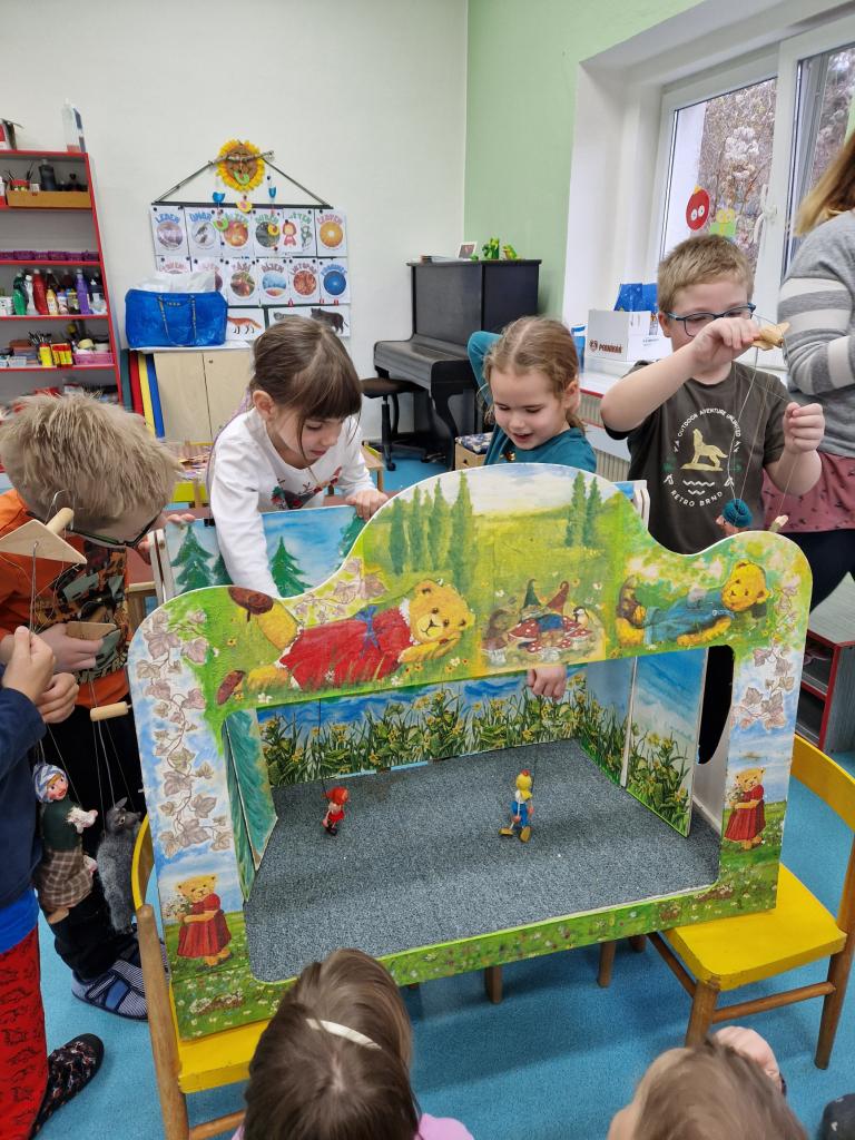 Děti si sami zkusily zahrát loutkové divadlo - pohádku "O červené Karkulce" :-) Pro velký zájem se pohádka několikrát opakovala, děti se v hraní vystřídaly :-)